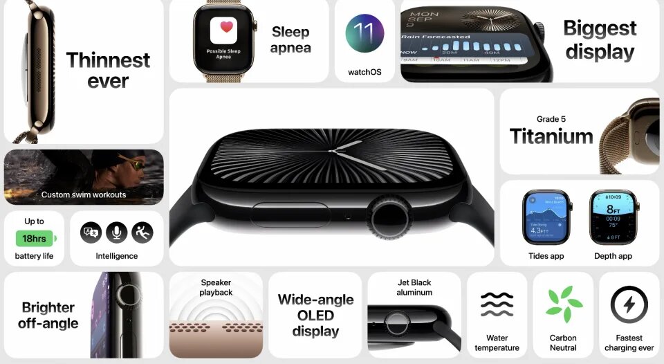 در این مراسم اپل واچ سری ۱۰ نیز رونمایی شد که قاب آن یک میلیمتر بیشتر از نسخه های قبلی است اما اندازه نمایشگر آن نیز بزرگ تر است.